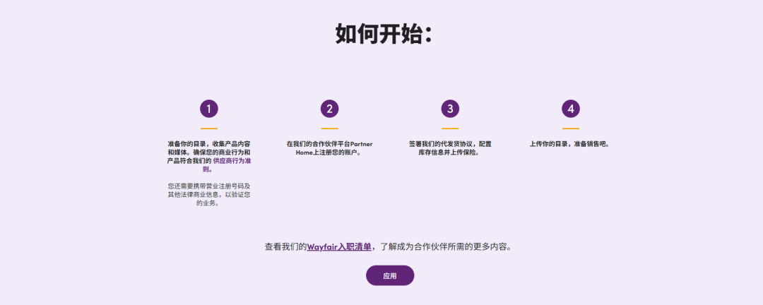 ![]() 图源:Wayfair官网 9.入驻流程 通过官网提交申请获取联系。 ![]() 图源:Wayfair官网 10.平台优势 垂直流量精准度高 平台用户均为主动搜索家居产品的高意向客群,转化率较亚马逊家居类目高2倍,花园家具类目转化率可达28%。 本土化物流兜底 CastleGate仓提供 “仓储+配送+安装+回收” 全链条服务,物流成本较自运营低 30%,且支持 伦敦核心区“当日达”。 运营成本可控 平台承担90%的营销费用(年投入超1.2亿英镑),卖家无需组建本地化团队,仅需聚焦供应链与选品。 |