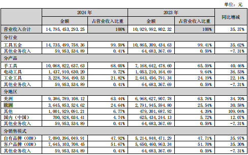 巨星科技2024年营业总收入147.95亿元,同比上升35.37%,归母净利润23.04亿元,同比上升36.18%。