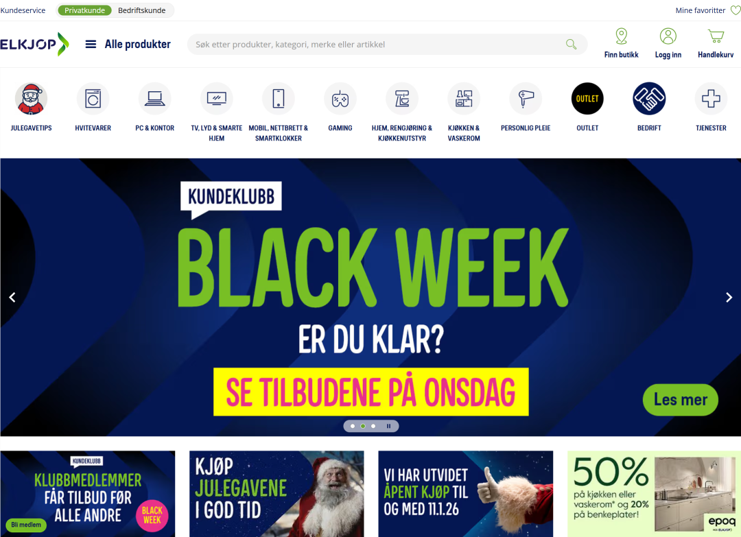 ![]() 1.平台介绍 Elkjøp是挪威最大的消费电子和白色家电零售商,于1962 年成立。 最初以本土小型零售业务为起点,逐步在挪威境内拓展门店网络。现在已成为挪威访问量最大的电子商务平台之一,拥有 4000 多名员工,约 150 家门店。 隶属于Elkjøp北欧集团(Elkjøp Nordic),该集团旗下的Elgiganten在瑞典和丹麦也同样处于市场领先地位。 ![]() 图源:Elkjøp官网 2.覆盖市场 核心市场在挪威本土。 3.商品类目 主要销售以消费电子和家电为核心。 热销类目包括电子产品、家用电器、厨房用品、办公设备及配件等。 4.市场表现 平台营收
