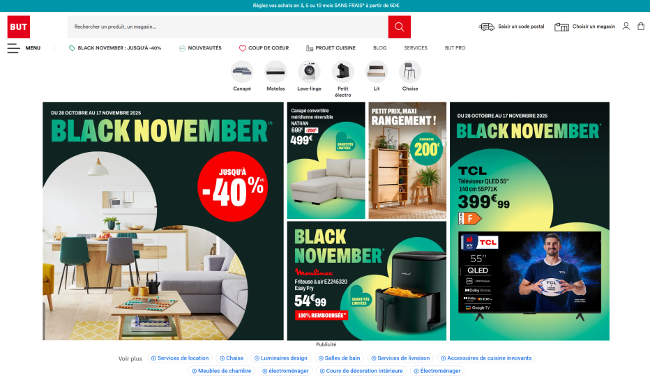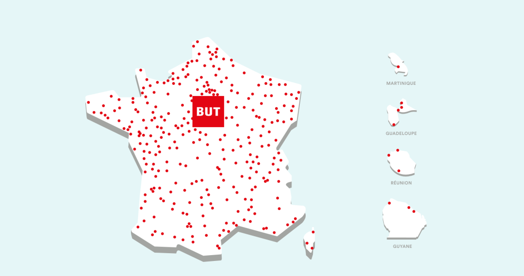 ![]() 1.平台介绍 BUT是法国领先的家居用品连锁零售商,成立于1972年,50 多年来,经过不断创新与发展,现在与Conforama同属于Groupement Les Mousquetaires集团旗下,如今集团已成为法国第二大家具及家电零售集团。 其核心优势是“线上+线下”全渠道的销售模式,并且始终紧跟现代零售业的发展趋势,持续拓展业务版图。从厨房到客厅、卧室,从家居装饰到家用电器,BUT一直在致力于更新产品品类,以满足不同人群的喜好、需求与预算。 ![]() 图源:BUT官网 2.覆盖市场 核心市场是法国本土,其门店网络覆盖了法国大部分地区,90%的法国人都知道这个品牌,80%的法国人口距离BUT分店不到20分钟车程,形成了强大的本地化覆盖优势。 ![]() 图源:BUT官网 3.商品类目 全方面提供中低档价位超15000种家居相关产品。 主要类目包括家具、家用电器、家居装饰、户外与园艺等等。 ![]() 图源:BUT官网 4.市场表现 平台营收