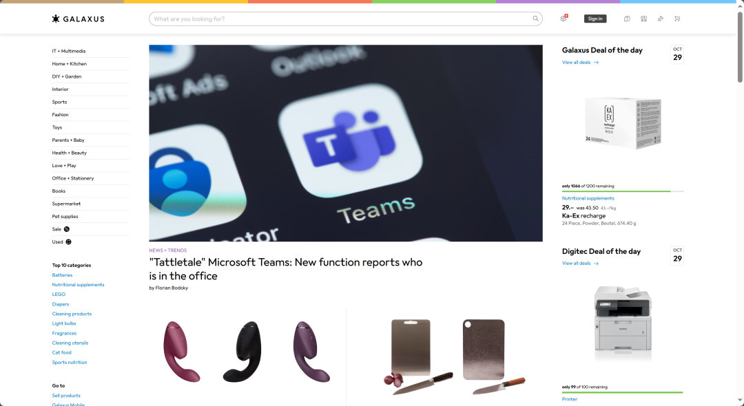 ![]() 1.平台介绍 Galaxus成立于 2012年,是 Digitec Galaxus AG(于2001年成立于瑞士)的全资子公司。Digitec Galaxus AG在瑞士和邻近欧盟国家经营着Digitec 和 Galaxus 两个线上平台。 其中,Galaxus是瑞士领先的在线零售商,为消费者提供全品类的商品,Digitec则瑞士领先的IT、电信和消费电子平台。 在瑞士本土电商市场中,Galaxus拥有强大的影响力,市场份额领先,是该国消费者网购的主要选择之一。 ![]() 图源:Galaxus官媒 2.覆盖市场 核心业务覆盖瑞士,随着发展逐渐将业务扩展至周边的欧盟国家包括德国、列支敦士登、奥地利、意大利、法国、比利时和荷兰。 3.商品类目 全品类的综合电商平台,拥有超过600万种产品。 热门品类包括健康和美容、IT和多媒体、玩具、宠物用品等。 在平台的“超市”分类下还提供食品杂货,几乎涵盖了消费者所有的生活场景。 ![]() 图源:Galaxus官媒 4.市场表现 平台营收
