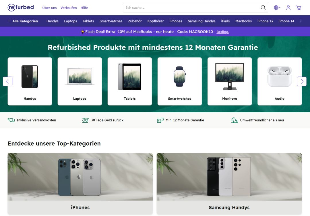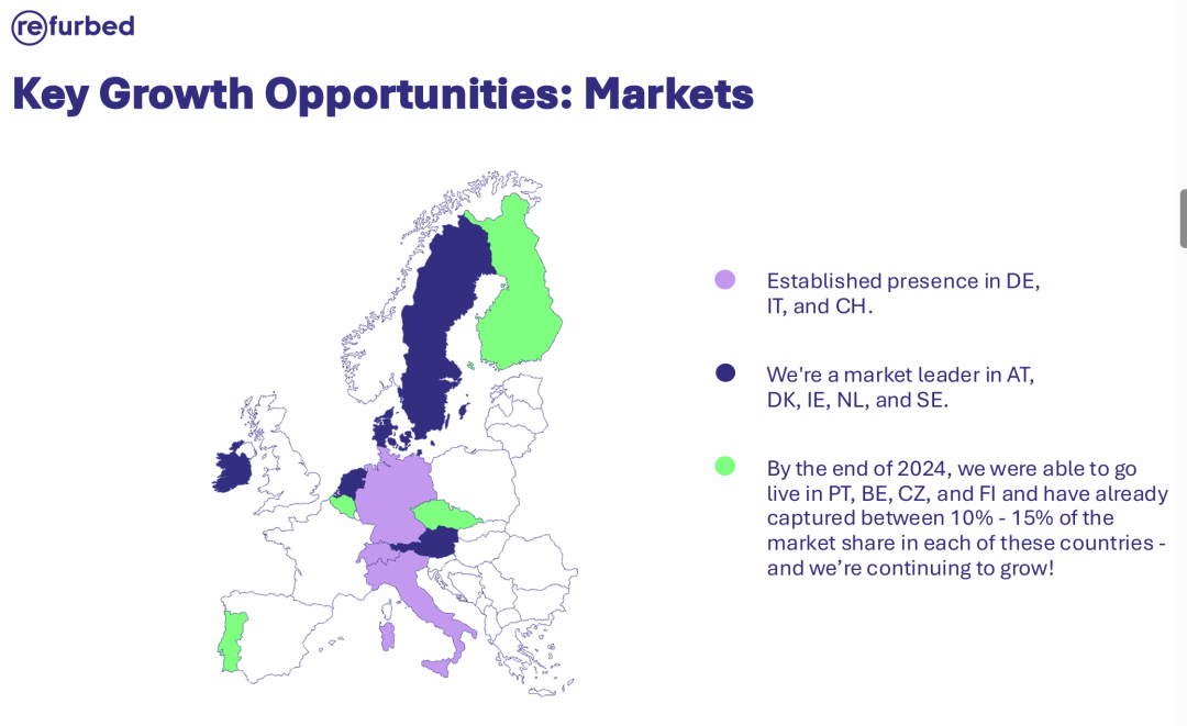 ![]() 1.平台介绍 Refurbed是德语国家增长最快的翻新产品在线市场,由 Peter Windischhofer、Kilian Kaminski 和 Jürgen Riedl于2017 年在奥地利维也纳创立。 其使命是通过为现有产品创造额外的生命周期来实现可持续消费。 作为一个快速崛起的电商平台,将环保理念与高性价比结合,成功开辟了一个细分市场。 ![]() 图源:Refurbed官媒 2.覆盖市场 核心业务覆盖欧洲,现活跃在 12 个国家/地区,包括德国、奥地利、瑞典、意大利、瑞士、爱尔兰、荷兰、丹麦、比利时、芬兰、葡萄牙和捷克。 其中德国是线上业务增长最快的市场。 2025年,Refurbed获得了4400万英镑(约合5600万美元)的新一轮融资,并明确表示将利用这笔资金进一步开拓欧洲市场。 ![]() 图源:Refurbed官网 3.商品类目 专注于翻新产品的销售,目前提供约 45,000 种产品,包括智能手机、笔记本电脑和平板电脑、家用电器、电动自行车和冬季运动配件等。 4.市场表现