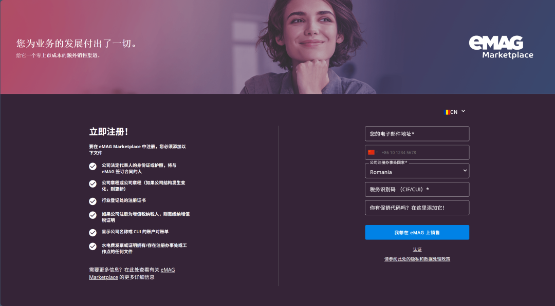 ![]() 图源:网络媒体 9.入驻流程 1)准备好营业执照、法人身份证等文件; 2)通过官方或合作渠道提交申请; 3)在资料齐全的情况下,最快可当天下店; 4)将商品发往罗马尼亚官方仓,即可开始销售。 ![]() 图源:eMAG官网 |