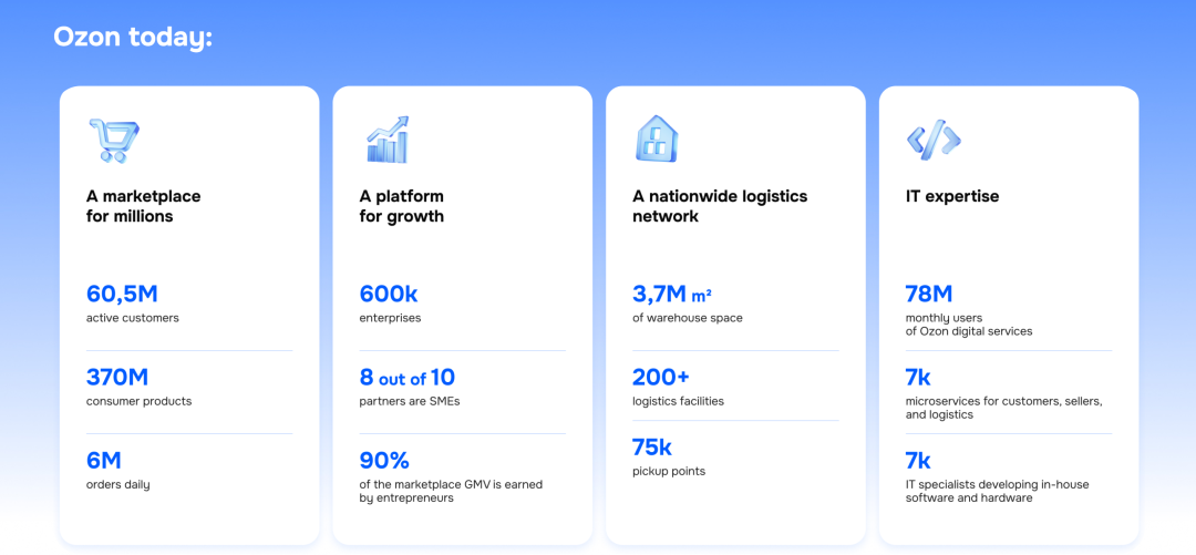 ![]() 1.平台介绍 Ozon是俄罗斯领先的多品类综合B2C电商平台,成立于1998年。 最初以在线书店起家,现已成功转型为覆盖电子产品、家居、服装等全品类的电商巨头,被誉为“俄罗斯的亚马逊”。 Ozon一直在积极招募中国卖家,不仅设立了深圳、横琴办公室,还在东莞等地建立了物流中心,并提供Ozon Premium等专属服务套餐,助力卖家业务增长。 ![]() 图源:网络媒体 2.覆盖市场 以俄罗斯为核心市场。 同时,平台积极扩展国际市场,目前已将业务扩张至哈萨克斯坦、白俄罗斯、亚美尼亚、吉尔吉斯斯坦、乌兹别克斯坦和阿塞拜疆等多个独联体国家。 3.商品类目 提供超过2000万SKU,覆盖全品类商品。 热销类目包括消费电子、家居与园艺、时尚与美妆、母婴与玩具等。 ![]() 图源:Ozon官网 4.市场表现(2025年Q2) 平台营收: