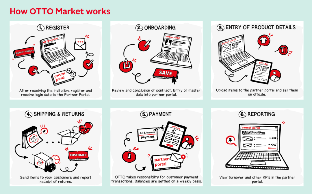 ![]() 图源:OTTO官网 9.入驻流程 1)通过官方或代理(如OTTO China)提交资质资料。 2)平台审核公司资质、产品合规性等。 3)审核通过后,设置后台账号并绑定支付方式(支持德国银行账户或第三方支付)。 4)上传商品信息,完善描述和图片。 5)开始销售:处理订单并发货。 ![]() 图源:OTTO官网 |