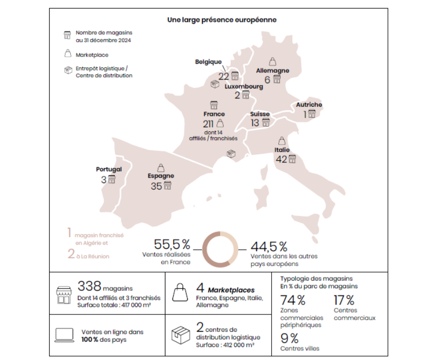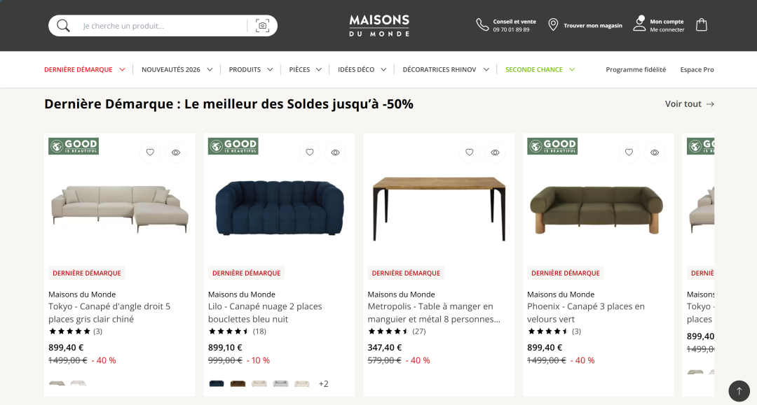 ![]() 1.平台介绍 Maisons du Monde是来自法国的欧洲家居零售领军品牌,1996年由Xavier Marie在法国布雷斯特创立,总部现位于法国韦尔图,2016年在巴黎泛欧交易所上市(代码:MDM)。 平台以“激励每个人敞开心扉,共同创造独特、温暖且可持续的生活空间”为宗旨,提供涵盖从经典住宅、民族住宅到现代住宅的多种风格家居选择,以“线下沉浸式体验+线上全品类覆盖”的运营优势,精准匹配欧洲消费者对家居美学与实用性的双重需求,成为了法国人最喜爱的家居品牌之一。 此外,平台高度重视可持续发展,68%的家具产品符合可持续标准,通过木材溯源系统、再生材料应用等举措强化环保属性,形成差异化竞争优势。2024年启动“灵感日常计划”,进一步提升产品可及性与用户体验,巩固欧洲家居零售核心玩家地位。 ![]() 图源:Maisons du Monde官网 2.覆盖市场 平台业务覆盖法国、意大利、西班牙、葡萄牙、比利时、奥地利、瑞士、德国等欧洲核心国家。 3.商品类目 家居领域全品类平台。 其中热销类目包括可持续家具(实木沙发、再生材料收纳柜)、户外家居(庭院沙发、遮阳伞、烧烤设备)、模块化家具(组合书架、可变形餐桌)、家纺用品(床品套件、毛巾、窗帘)等。 ![]() 图源:Maisons du Monde官网 4.市场表现 平台营收(2025年第三季度)