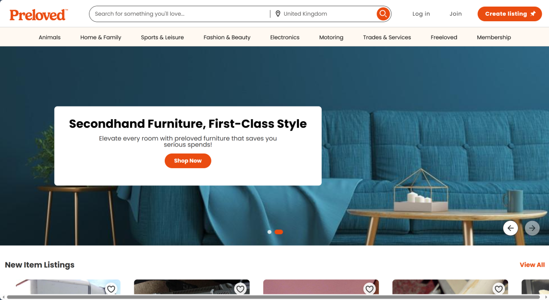 ![]() 1.平台介绍 Preloved是英国本土领先的分类广告与二手交易平台,成立于1998年,现隶属于THG Ingenuity(2025年由The Hut Group 拆分的独立技术物流子公司)。 平台专注连接个人与企业用户,以 “无佣金交易+社区化运营+可持续理念” 为核心。其拒绝拍卖模式、零listing费的轻量化运营,叠加对动物福利与环保的深度投入,完美契合英国消费者高性价比和社会责任的双重需求,同时也为个人与企业卖家提供低门槛的变现渠道。 ![]() 图源:Preloved官网 2.覆盖市场 平台核心市场为英国本土。 3.商品类目 全品类平台,覆盖500+细分品类。 其中热销类目包括宠物与马匹、家具与家居用品、服装与珠宝、电子产品等。 4.市场表现 运营数据